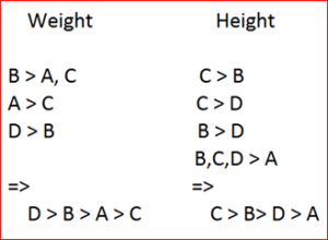 2 pointsAmong A, B, C and D, B is heavier than A and C but C is taller than him. D is not as tall as C while A is shortest. C is not as heavy as A. D is not as tall as C while A is shortest. C is not as heavy as A. D is heavier than B but shorter than him.