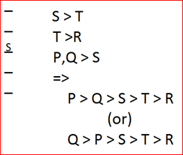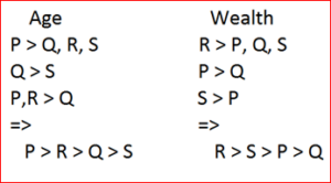 2 pointsP, Q, R and S are four males. P is the eldest in the group but he is not the poorest. R is the richest but not the eldest, Q is elder than S but he is not the eldest, Q is elder than S. How can the four persons be arranged in descending order of their age and money?