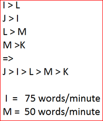 2 pointsFive people I, J, K, L and M type at different speeds. I type faster than L but slower than J. M types slower than L but is not the slowest. The one who types the second fastest, types at a speed of 75 words/minute. The one who types the second slowest types at the speed of 50 words/minute.
